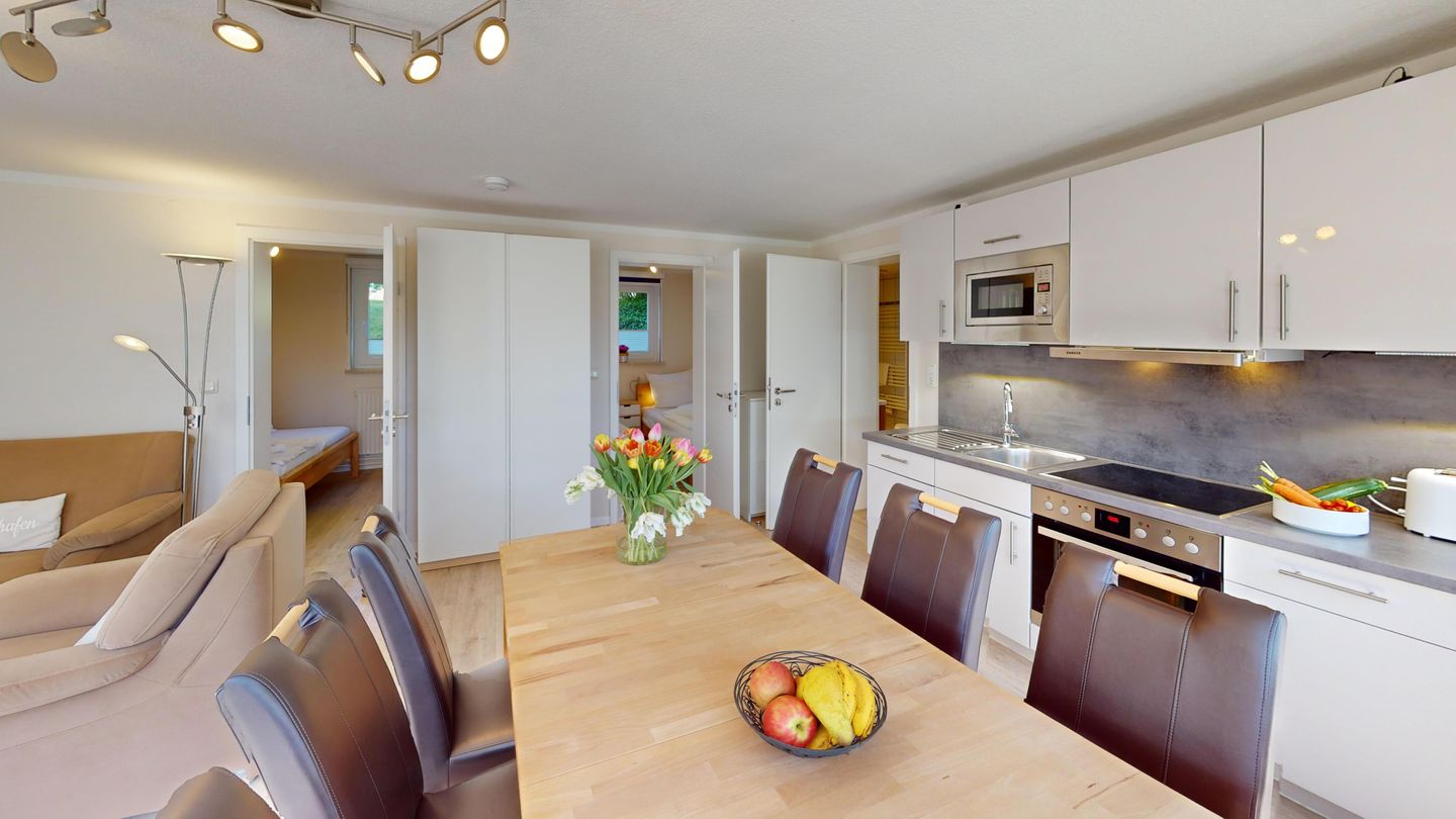 Diese strandnahe 55 m²-Ferienwohnung befindet sich ebenerdig im Halbsouterrain und ist für einen Urlaub mit bis zu vier Personen geeignet. Privates Parken direkt am Haus. Die Wohnung verfügt über zwei Schlafzimmer, eins mit einem Doppelbett, das andere mit zwei Einzelbetten, ein Badezimmer mit Dusche, eine offene, gut ausgestattete Küchenzeile und einen gemütlichen Wohn-/ Essbereich (Wohn- und Schlafzimmer haben richtige Fenster). Auf Wunsch stellen wir Ihnen gerne kostenfrei ein Kinderbett und einen Hochstuhl zur Verfügung. Genießen Sie Ihre Zeit im Gästegarten mit Grill, und Gartenhaus. Bollerwagen stehen Ihnen je nach Verfügbarkeit kostenlos zur Verfügung. Die Sauna im Apartmenthaus Solaris kann ebenfalls mitbenutzt werden. In diese Wohnung können Sie gerne Ihren Hund mitbringen.