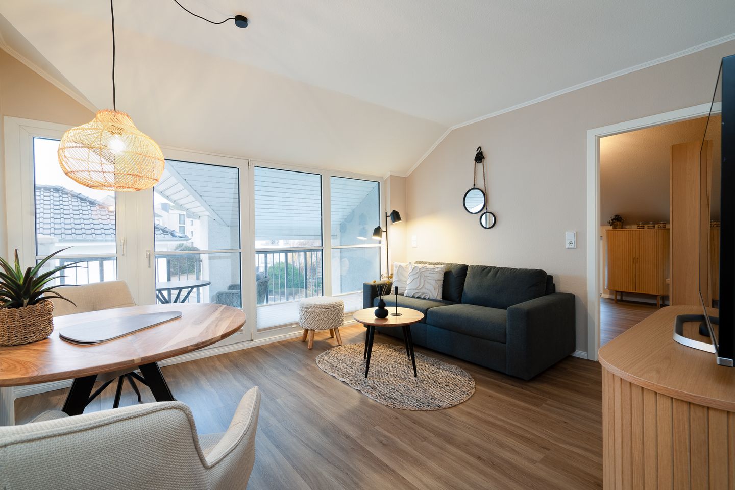 Willkommen in dieser liebevoll eingerichteten 36 m² großen Ferienwohnung, in der Komfort, Stil und Wohlfühlatmosphäre harmonisch aufeinandertreffen. Bereits beim Betreten gelangen Sie über einen kleinen Vorflur zur praktischen Küchenzeile, die mit Backofen, 2-Platten-Kochfeld und Kaffeemaschine alles bietet, was Sie für die Zubereitung leckerer Mahlzeiten benötigen. Der anschließende offene Wohn-Essbereich lädt zum Entspannen ein: Ein gemütlicher Esstisch und eine komfortable Sofa-TV-Ecke schaffen den idealen Ort für entspannte Abende. Von hier erreichen Sie auch den Balkon, auf dem Sie frische Luft und sonnige Momente genießen können. Das moderne Badezimmer überzeugt mit einem stilvollen Waschtisch, einer Dusche und einem WC – frisch, hell und hochwertig ausgestattet. Im separaten Schlafzimmer erwartet Sie ein komfortables Doppelbett sowie ausreichend Stauraum dank Kommode und Kleiderschrank. Hier können Sie erholsame Nächte verbringen und neue Energie für den nächsten Urlaubstag tanken. Diese Wohnung ist die perfekte Wahl für Paare, die Wert auf Komfort, modernes Design und eine entspannte Atmosphäre legen. Und das Beste: Auch Ihr Hund ist hier herzlich willkommen, sodass einem unvergesslichen Aufenthalt nichts im Wege steht!