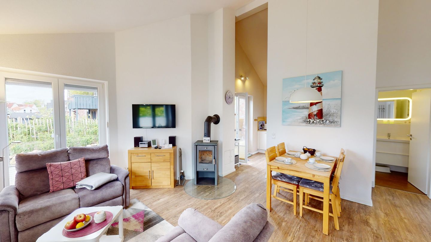 Nur wenige Gehminuten vom Strand entfernt befindet sich dieses 60 m² große Ferienhaus, welches für eine Belegung mit bis zu 4 Personen und auch Ihren Hund ausgelegt ist. Ihren PKW können Sie direkt neben dem Haus parken. Das Haus bietet Ihnen einen gemütlichen Wohnbereich mit Kaminofen sowie einen offenen Essbereich, der direkt an die voll ausgestattete Küche angrenzt. Von hier aus gelangen Sie auf die möblierte Terrasse mit Strandkorb und Grill sowie einen eingezäunten Garten. Im Gartenhaus können Sie Ihre mitgebrachten Fahrräder unterstellen. Ein Schlafzimmer verfügt über ein Doppelbett, das andere über zwei komfortable Einzelbetten. Es gibt ein helles Badezimmer mit WC und bodengleicher Dusche.