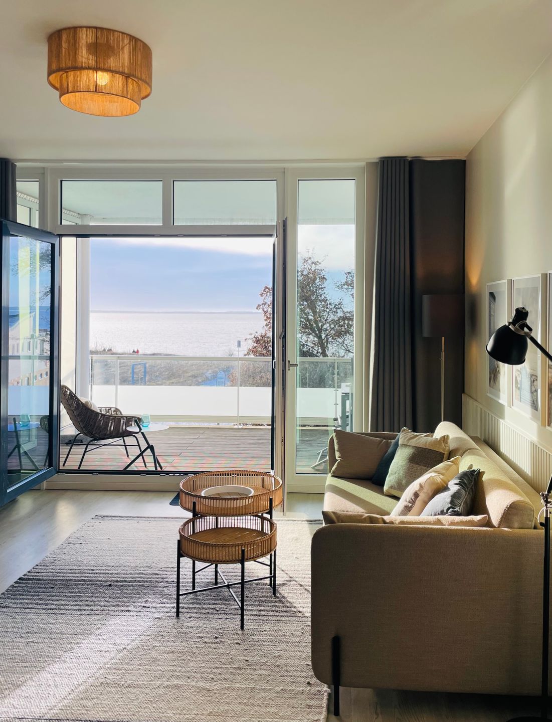 Willkommen in Ihrem Urlaubsapartment E-06! Das 70 qm große 2-Zimmer Apartment befindet sich im 2. Obergeschoss des Hauses E. Es ist für eine Belegung mit 4 Personen ausgelegt. Parken Sie Ihr Auto ganz bequem auf dem wohnungseigenen Tiefgaragenstellplatz. Mit dem Aufzug oder über die Treppe gelangen Sie zum Apartment. Der Eingangsbereich des Apartments führt Sie vorbei an einem geräumigen Garderobenschrank rechterhand in das moderne Badezimmer mit Wohlfühlfaktor. Ihnen steht sowohl eine Badewanne, als auch eine Dusche zur Verfügung. Einem Vollbad bei Kerzenschein steht somit nichts im Weg! Zurück im Eingangsbereich erwartet Sie geradeaus direkt das Herzstück des Ferienappartements, der große, lichtdurchflutete Wohnbereich mit einmaligem Meerblick! Die offene, voll ausgestattete Einbauküche mit Nespresso-Kaffeemaschine, ein einladender Essplatz und ein gemütlicher Sofabereich mit großem Flachbildfernseher machen das Urlaubsgefühl perfekt! Das Sofa bietet eine Schlaffunktion für 2 Personen. Über das Wohnzimmer erreichen Sie außerdem das komfortable Schlafzimmer. Ein tolles Boxspring-Doppelbett, ein weiterer Flachbildfernseher, ein geräumiger Kleiderschrank und ein Schreibtisch zählen zur Ausstattung. Auf die Sonnenterrasse mit frontalem Meerblick gelangen Sie sowohl über das Schlafzimmer, als auch über das Wohnzimmer. Zwei Sonnenliegen sowie ein Tisch und vier Terrassenstühle laden zum gemütlichen Beisammensein ein. Eine eigene Waschmaschine steht in der Wohnung für Sie bereit. Der Strand ist nur wenige Schritte von Ihrer Ferienunterkunft entfernt! Begeben Sie sich auf eine erste Reise durch das Apartment - über den virtuellen 360° Rundgang!