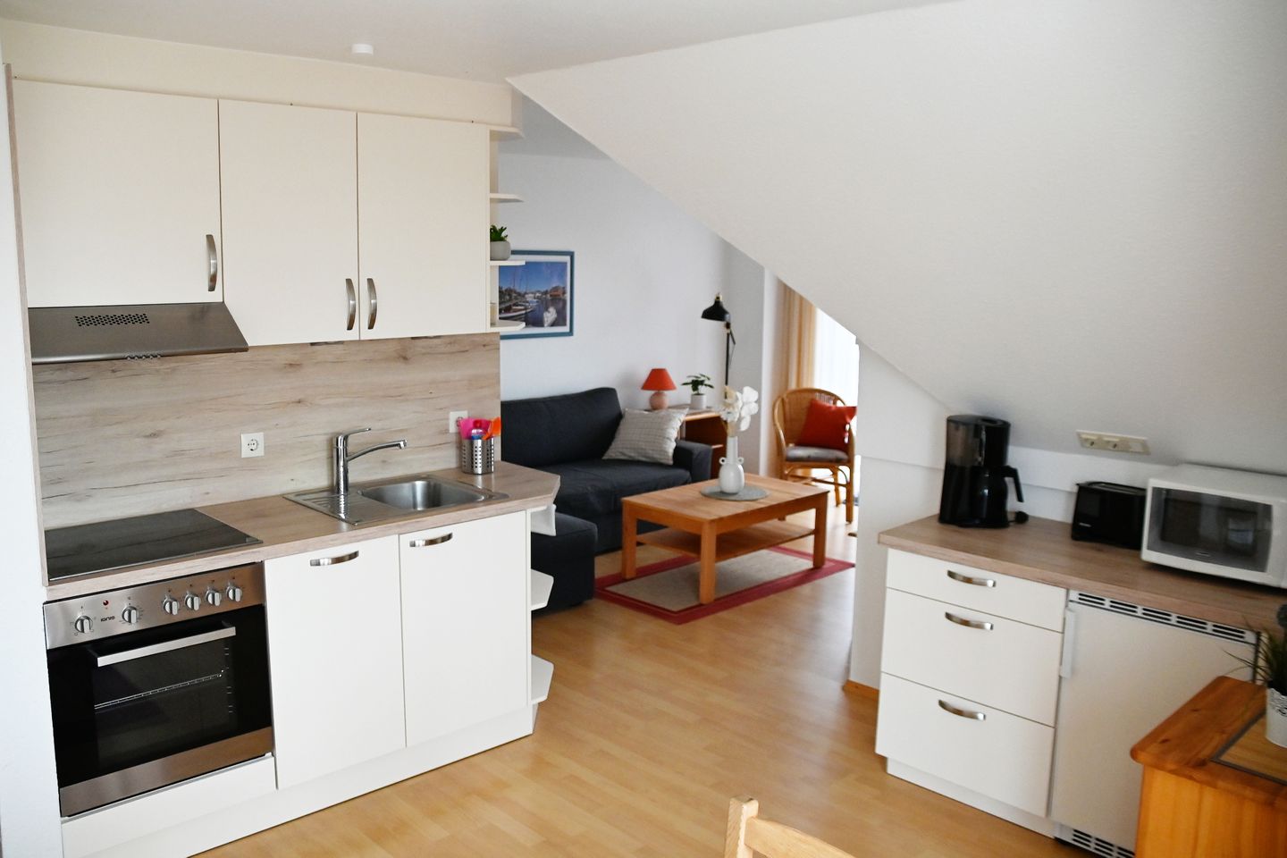 Nur wenige Schritte von der Ostsee entfernt, in dem idyllischen Hafenort Lemkenhafen auf Fehmarn, erwartet Sie diese liebevoll eingerichtete 48 m² große Ferienwohnung – perfekt für 2 Personen, die Ruhe, Erholung und das maritime Lebensgefühl suchen. Ein privater Parkplatz direkt am Haus sorgt für maximalen Komfort. Die Wohnung liegt im Obergeschoss des Hauses Nr. 10 mit nur vier Einheiten, innerhalb der Ferienanlage Lemkenhafen – ruhig, überschaubar und wunderbar entspannt. Bitte beachten Sie, vor der Haustür befinden sich 5 Stufen. Innen empfängt Sie ein gemütliches Wohnzimmer, das mit einem komfortablen Sofa zum Ankommen und Durchatmen einlädt. Die offene Küche mit angrenzendem Essbereich ist bestens geeignet für kulinarische Stunden zu zweit. Im separaten Schlafzimmer mit Doppelbett genießen Sie erholsame Nächte Ein modernes Duschbad rundet das Wohlfühlambiente ab. Das absolute Highlight? Der möblierte Balkon – hier können Sie bei frischer Ostseeluft die Sonne genießen, frühstücken oder am Abend den atemberaubenden Sonnenuntergang durch das Panoramafenster bewundern. Auch an Ihre Fahrräder ist gedacht: Diese können bequem und sicher am Fahrradständer direkt am Haus abgestellt werden.