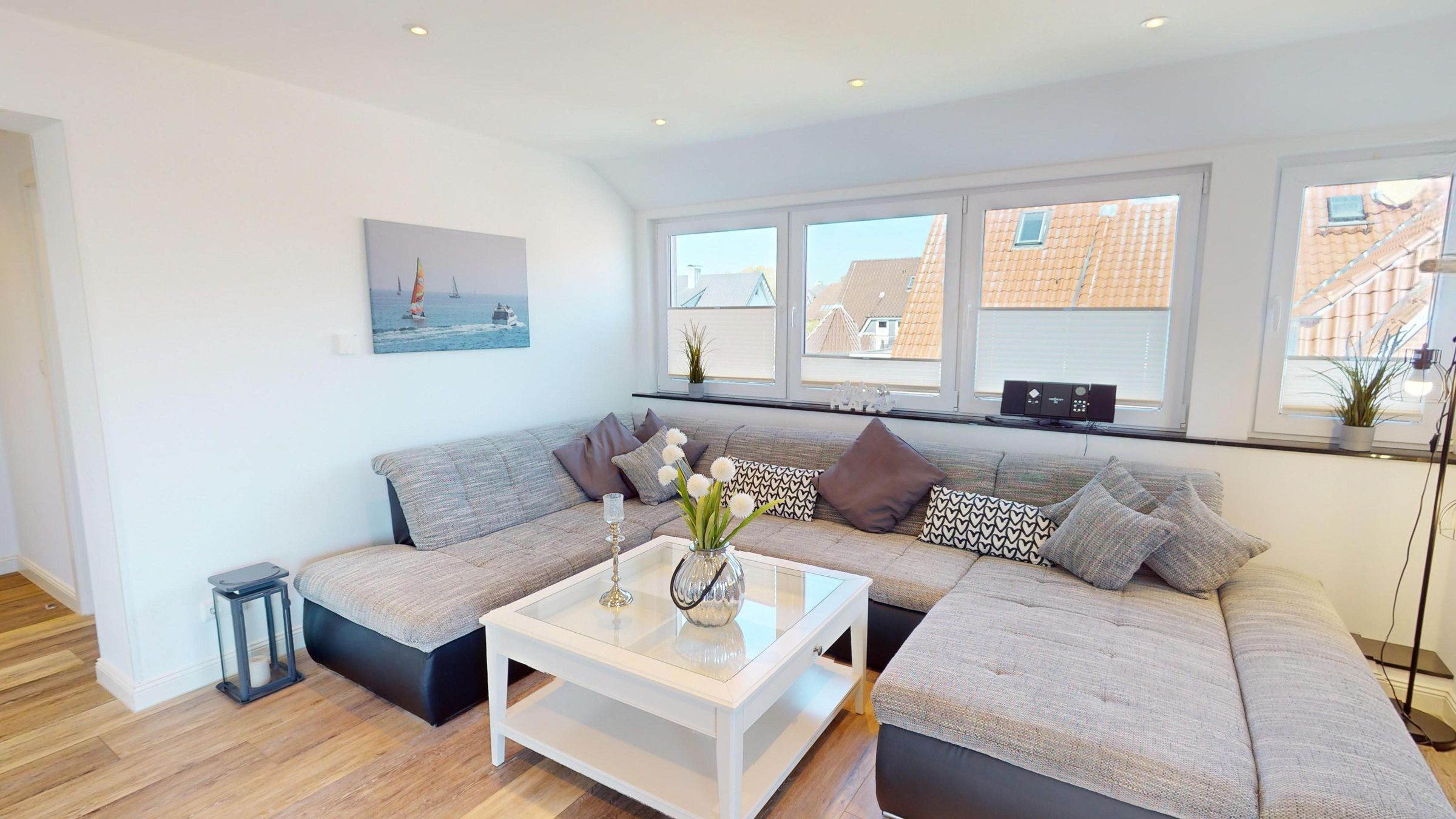 Die Luxus-Ferienwohnung "Muschel" in der Villa Klarsinni II liegt im 1. Stock des Hauses, geht über zwei Etagen und ist hochwertig möbliert. Sie liegt parallel zur Wohnung "Krabbe" und es bietet sich an, bei mehr als sechs Personen beide Wohnungen zu buchen. Drei Schlafzimmer für bis zu 4 Erwachsene und 2 Kinder stehen für Ihren Urlaub bereit! Ob Küche, Bäder oder Schlafzimmer - alles ist modern und hochwertig ausgestattet und genügt höchsten Ansprüchen! In der oberen Etage der Wohnung befinden sich zwei Schlafzimmer, jeweils mit zwei Einzelbetten ausgestattet, die insgesamt vier Schlafmöglichkeiten bieten. In einem Zimmer befindet sich zusätzlich ein Holz-Kinderbett (60 x 120 cm). Das dritte Schlafzimmer mit Doppelbett befindet sich auf der Wohnebene. Der schöne, offene Wohnküchenbereich ist mit Geschirrspüler, Backofen und Nespressomaschine ausgestattet. Eine herrliche Sonnenterrasse lädt zum Frühstücken oder zum Verweilen an lauen Sommerabenden ein. Gerne dürfen Sie auch den gemeinschaftlichen Grillplatz hinter dem Haus mitbenutzen! Die gemeinschaftlich genutzte Sauna hinter dem Haus 21 steht Ihnen für die Zeit Ihres Urlaubs zur Verfügung (gegen 2€ Gebühr). Ein Fahrradständer befindet sich hinter dem Haus. Für Ihr Auto steht an der Unterkunft ein reservierter Parkplatz bereit.