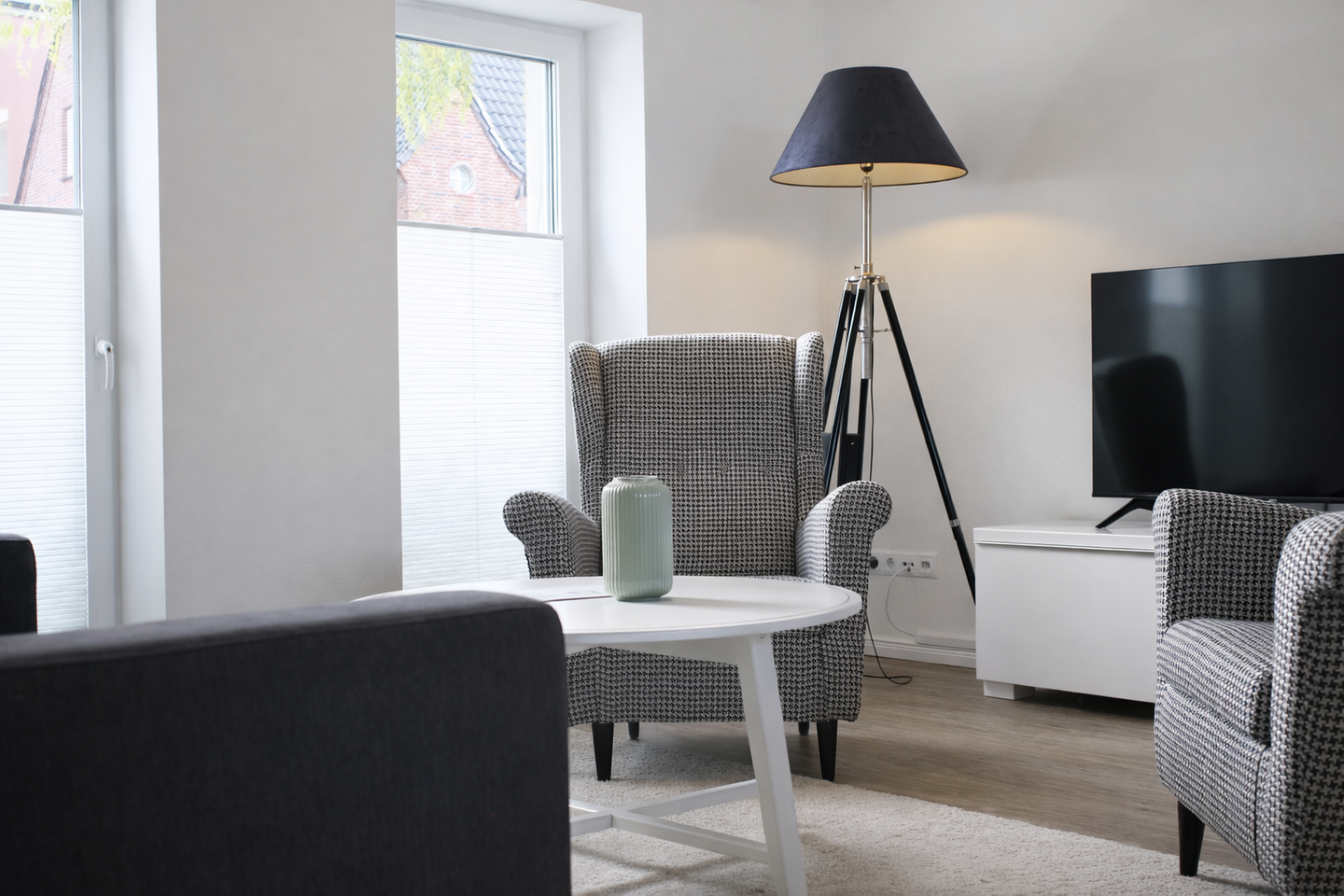 Ankommen, abschalten und wohlfühlen – stilvolle 43m² Ferienwohnung mit liebevollen Details, durchdachter Ausstattung und auch Ihr Hund ist hier willkommen. Diese charmante und hochwertig ausgestattete Ferienwohnung bietet Ihnen den perfekten Rückzugsort für eine erholsame Auszeit. Bereits beim Betreten der Wohnung werden Sie von einem kleinen, einladenden Vorflur empfangen, der Ihnen den Zugang zu allen Wohnbereichen eröffnet. Rechts erwartet Sie das moderne Tageslichtbad mit Fenster, in dem klare Linien auf Komfort treffen: Ein stilvoller Waschtisch, ein WC sowie eine großzügige, ebenerdige Dusche sorgen für einen entspannten Start in den Tag. Hochwertige Armaturen und liebevoll ausgewählte Details schaffen hier eine kleine Wohlfühloase. Auf der linken Seite befindet sich das gemütliche Schlafzimmer, das mit einem komfortablen Doppelbett, zwei Nachttischen und einem großzügigen Kleiderschrank ausgestattet ist. Warme Farben, weiche Textilien und eine angenehme Raumaufteilung schaffen hier den perfekten Ort für erholsame Nächte. Das Herzstück der Wohnung bildet der großzügige Wohn- und Essbereich – hell, offen und modern gestaltet. Die hochwertige Einbauküche ist voll ausgestattet und lässt keine Wünsche offen – ob gemütliches Frühstück, gemeinsames Kochen oder ein romantisches Abendessen, hier haben Sie alles, was Sie brauchen. Ein einladendes Sofa, welches eine weitere Schlafmöglichkeit für zwei Personen bietet mit Couchtisch sowie ein elegantes Sideboard mit Flachbild-TV laden zu entspannten Stunden ein – sei es mit einem guten Buch, einem Filmabend oder einfach zum Seele baumeln lassen. Plissees an allen Fenstern sorgen nicht nur für angenehmen Sicht- und Sonnenschutz, sondern unterstreichen auch das stilvolle, harmonische Wohnambiente. Ob Sie Ruhe suchen, zu zweit entspannen oder einfach in schöner Umgebung neue Energie tanken möchten – diese Ferienwohnung bietet Ihnen die ideale Kombination aus Gemütlichkeit, Funktionalität und modernem Wohnkomfort.