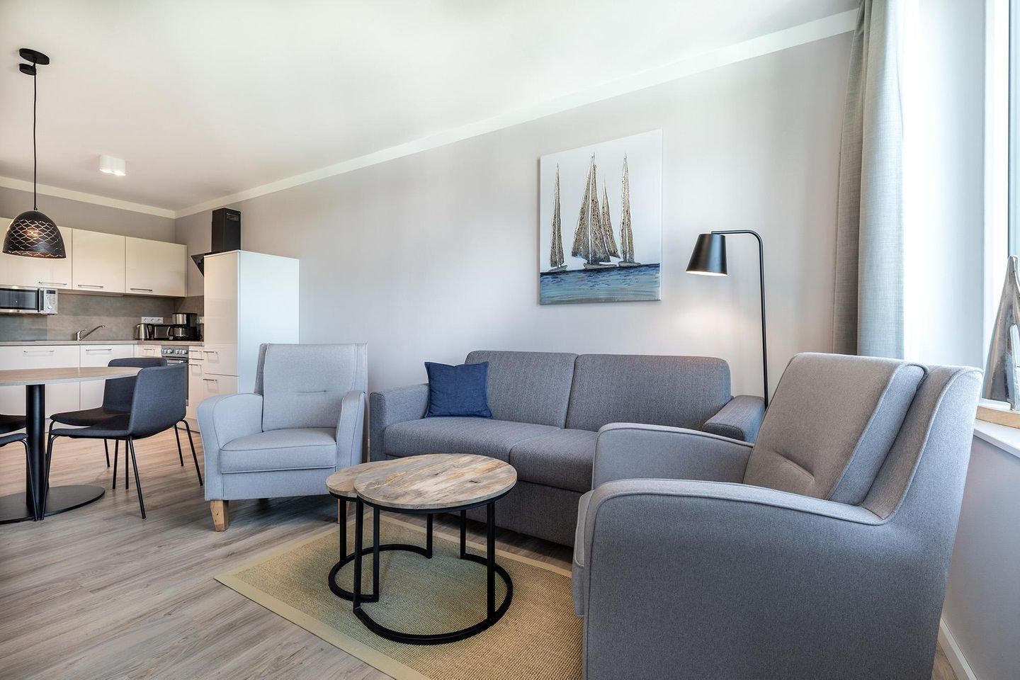 Lassen Sie den Alltag hinter sich und genießen Sie Ihre Auszeit in einem geschmackvoll eingerichteten Apartment, das Ihnen Entspannung, Komfort und Ostseefeeling auf höchstem Niveau bietet. Dieses ca. 44 m² große, moderne 2-Zimmer-Apartment liegt in unmittelbarer Nähe zur Ostsee und ist ideal für bis zu vier Personen. Es überzeugt nicht nur durch seine hochwertige Ausstattung, sondern auch durch seine fantastische Lage direkt am idyllischen Godewindpark. Ein besonderes Highlight ist die Loggia, die sowohl vom Wohnbereich als auch vom Schlafzimmer aus zugänglich ist. Beginnen Sie hier den Tag mit einem Frühstück im Freien, während Sie den Blick in den Godewindpark mit herrlichem altem Baumbestand schweifen lassen und die klare, salzige Luft der nahen Ostsee einatmen. Für Ihre Auszeit am Strand steht Ihnen während der Saison sogar ein eigener XL-Strandkorb kostenlos zur Verfügung – ein exklusiver Platz für entspannte Stunden am Meer. Im Inneren erwartet Sie ein lichtdurchflutetes, stilvoll eingerichtetes Nichtraucher-Apartment mit allem, was Sie sich für einen erholsamen Aufenthalt wünschen: bodentiefe, sonnenschutzverglaste Fenster, eine angenehme Fußbodenheizung, kostenfreies WLAN und ein durchdachtes Raumkonzept, das Funktionalität und Wohlgefühl perfekt verbindet. Die offene Küche ist hochwertig ausgestattet und bietet Ihnen alles für die Selbstverpflegung: Geschirrspüler, Kühl-Gefrierkombination, Glaskeramikkochfeld, Backofen, Mikrowelle, Kaffeemaschine, Wasserkocher und Toaster – perfekt für ein entspanntes Frühstück oder ein selbstgekochtes Abendessen nach einem Tag am Strand. Der behagliche Wohnbereich lädt mit einer komfortablen Doppelschlafcouch zum Verweilen ein. Ein SMART-TV sorgt für Unterhaltung. Im separaten Schlafzimmer erwartet Sie ein großzügiges Boxspringbett sowie ein weiterer SMART-TV – ideal für entspannte Abende oder ein ruhiges Nickerchen nach einem langen Spaziergang am Meer. Für stimmungsvolle Lichtakzente lassen sich die Deckenleuchten im Wohn-, Schlaf- und Eingangsbereich bequem dimmen. Das moderne Badezimmer ist mit einer ebenerdigen Dusche, WC, Waschtisch mit Föhn, Kosmetikspiegel, Handtuchheizkörper und ebenfalls Fußbodenheizung ausgestattet – eine Oase für Ihre tägliche Erholung. Und das Beste: Auch Ihr Hund ist hier herzlich willkommen, sodass einem unvergesslichen Aufenthalt nichts im Wege steht. Die beiden Wohnungen 2.12 und 2.14 liegen direkt nebeneinander. Wenn Sie beide Wohnungen zusammen buchen möchten, dann bekommen Sie 20% Rabatt auf die Miete der zweiten Wohnung (ausgenommen ist die Hauptsaison A). Hierzu nehmen Sie bitte mit uns Kontakt auf: Tel. 04561-6139390 oder info@urlaubanderostsee.de