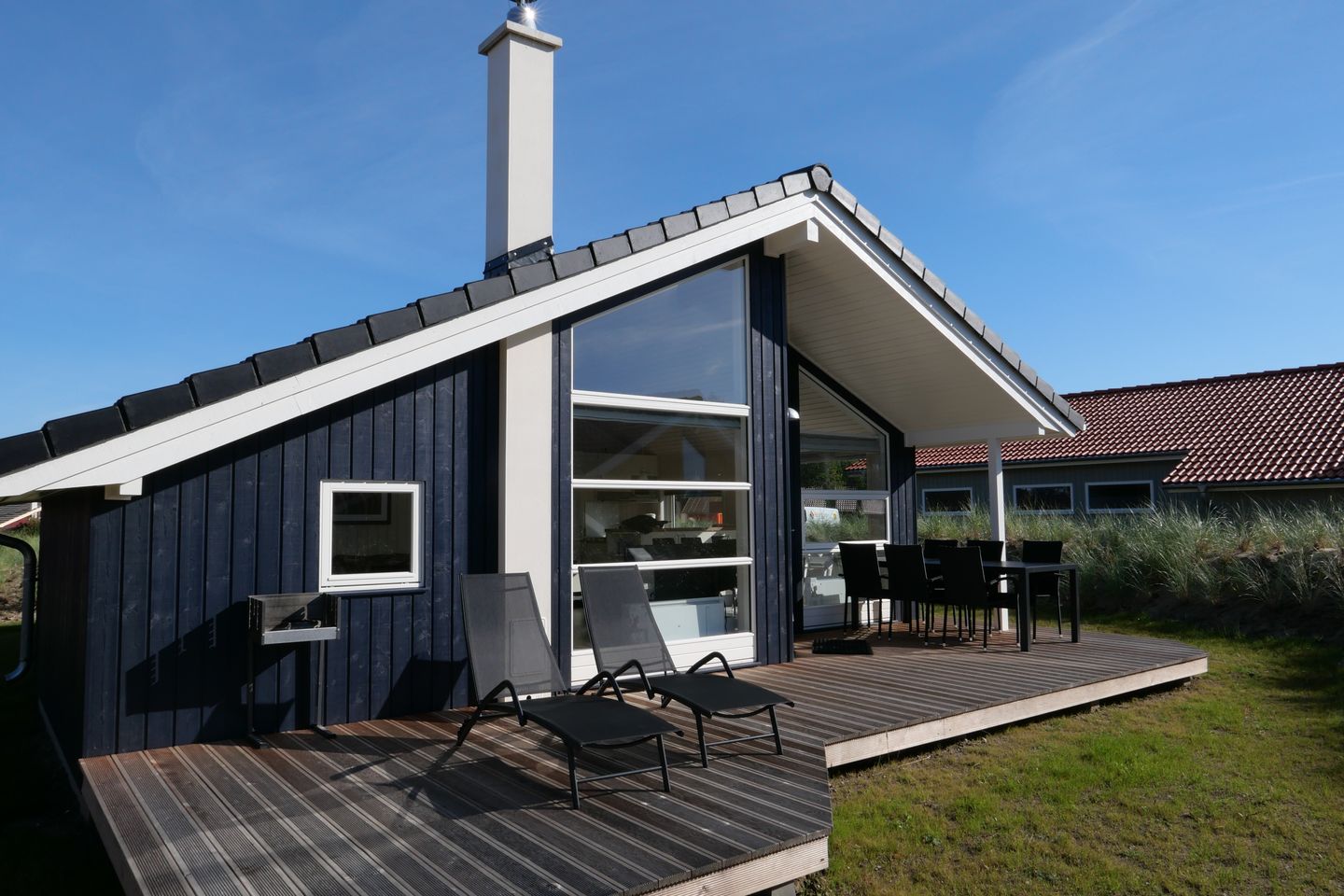 Das modern und komfortabel eingerichtete 62m² Haus bietet zwei Schlafzimmer sowie einen gemütlichen Alkoven mit Doppelbetten - ideal für 4-6 Personen und zwei Hunde. Große Fenster schaffen eine helle, freundliche Atmosphäre. Der offene Wohn- und Essbereich mit voll ausgestatteter Küche lädt zum Entspannen und Genießen ein. Zur Unterhaltung stehen Flachbild-Sat-TV, DVD-/Blu-ray-Player, Stereoanlage und kostenfreies WLAN bereit. Ein Kaminofen und die hauseigene Sauna sorgen besonders an kühleren Tagen für wohlige Wärme. Das Bad verfügt über Fußbodenheizung und eine Waschmaschine mit Trocknerfunktion. Die möblierte, teils überdachte Terrasse mit zwei Sonnenliegen bietet den perfekten Platz für entspannte Sommerabende. Bitte beachten Sie: Manche Häuser verfügen über ein Geländer um die Terrasse herum, andere nicht. Bei den Außen- und Innenbildern handelt es sich um Modellbilder unterschiedlicher Ferienhäuser.
