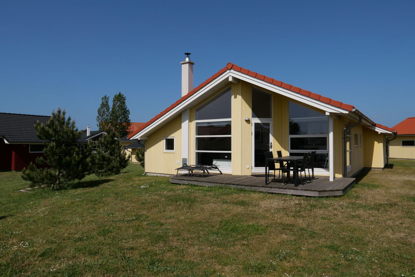 Komfortables und geräumiges 79m² Ferienhaus mit skandinavischem Flair nahe dem schönen Ostseestrand von Großenbrode gelegen. Das Haus ist aufgrund der drei Schlafzimmer ideal für 6-8 Personen und zwei Hunde geeignet. Das Ferienhaus ist sehr geräumig, hell und freundlich gestaltet, die großen Fenster sorgen für eine angenehme Wohnatmosphäre. Mit 3 nebeneinander liegenden Schlafzimmern und dem Alkoven befinden sich Schlafplätze für max. 8 Personen im Haus. 2 Schlafzimmer verfügen über Doppelbetten, 1 Schlafzimmer über 2 Einzelbetten und der bei Kindern und Teenagern beliebte Alkoven ist mit einen weiteren Doppelbett ausgestattet. Ein Kinderbett und ein Kinderhochstuhl gehört zum Haus. Ein offener Wohn- und Küchenbereich sorgt für ein großzügiges Wohngefühl, das gemütliches Sofa lädt zum Chillen ein und am großen Esstisch genießen Sie Ihre selbstgekochten kulinarischen Highlights. Im Wohnbereich befinden sich der Kaminofen, der Flachbild Sat-TV, ein DVD-Player bzw. Blue-Ray Player, eine Stereoanlage mit Radio. Vom Wohnbereich aus haben Sie Zugang zur teils überdachten, mit Gartentisch und Stühlen möblierten Terrasse, auf der Sie die langen Sommerabende genießen können. 2 Sonnenliegen stehen Ihnen ebenfalls zur freien Verfügung. Im Haus befinden sich 2 Badezimmer mit Fußbodenheizung. Vom größeren Bad aus haben Sie Zugang zur eigenen Sauna. Zur Ausstattung gehört eine Waschmaschine mit Trocknerfunktion. Die Küche ist vollwertig ausgestattet mit Spülmaschine, Kühlschrank mit Gefrierfach, Ceranfeld-Herd, Mikrowelle und Kaffeemaschine. Bitte beachten Sie: Manche Häuser verfügen über ein Geländer um die Terrasse herum, andere nicht. Bei den Außen- und Innenbildern handelt es sich um Modellbilder unterschiedlicher Ferienhäuser.