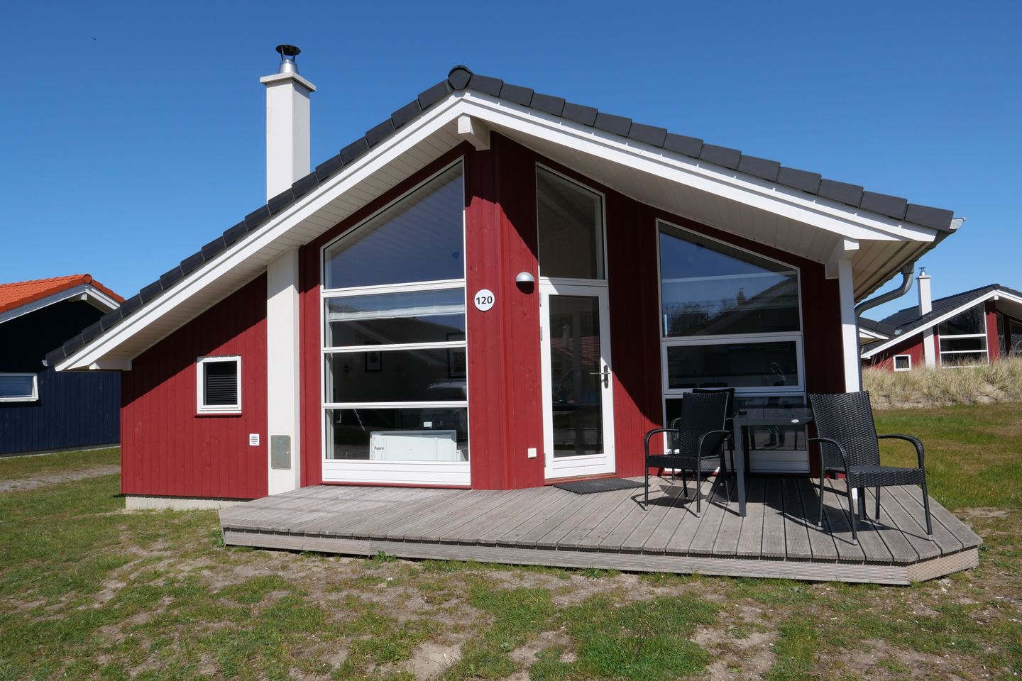 Komfortables und 79m² großes Ferienhaus mit skandinavischem Flair nahe dem schönen Ostseestrand von Großenbrode gelegen. Das Haus ist aufgrund der drei Schlafzimmer ideal für 6-8 Personen, und Ihr Hund ist natürlich herzlich willkommen. Das Ferienhaus ist sehr geräumig, hell und freundlich gestaltet, die großen Fenster sorgen für eine angenehme Wohnatmosphäre. Mit 3 nebeneinander liegenden Schlafzimmern und dem Alkoven befinden sich Schlafplätze für max. 8 Personen im Haus. 2 Schlafzimmer verfügen über Doppelbetten, 1 Schlafzimmer über 2 Einzelbetten und der bei Kindern und Teenagern beliebte Alkoven ist mit einen weiteren Doppelbett ausgestattet. Ein Kinderbett und ein Kinderhochstuhl gehört zum Haus. Ein offener Wohn- und Küchenbereich sorgt für ein großzügiges Wohngefühl, das gemütliches Sofa lädt zum Chillen ein und am großen Esstisch genießen Sie Ihre selbstgekochten kulinarischen Highlights. Im Wohnbereich befinden sich der Kaminofen, der Flachbild Sat-TV, ein DVD-Player bzw. Blue-Ray Player, eine Stereoanlage mit Radio. Vom Wohnbereich aus haben Sie Zugang zur teils überdachten, mit Gartentisch und Stühlen möblierten Terrasse, auf der Sie die langen Sommerabende genießen können. 2 Sonnenliegen stehen Ihnen ebenfalls zur freien Verfügung. Im Haus befinden sich 2 Badezimmer mit Fußbodenheizung. Vom größeren Bad aus haben Sie Zugang zum eigenen Wellnesbereich sorgt für das gute Wohlbefinden. Zur Ausstattung gehört eine Waschmaschine mit Trocknerfunktion. Die Küche ist vollwertig ausgestattet mit Spülmaschine, Kühlschrank mit Gefrierfach, Ceranfeld-Herd, Mikrowelle und Kaffeemaschine. Bitte beachten Sie: Manche Häuser verfügen über ein Geländer um die Terrasse herum, andere nicht. Bei den Außen- und Innenbildern handelt es sich um Modellbilder unterschiedlicher Ferienhäuser.
