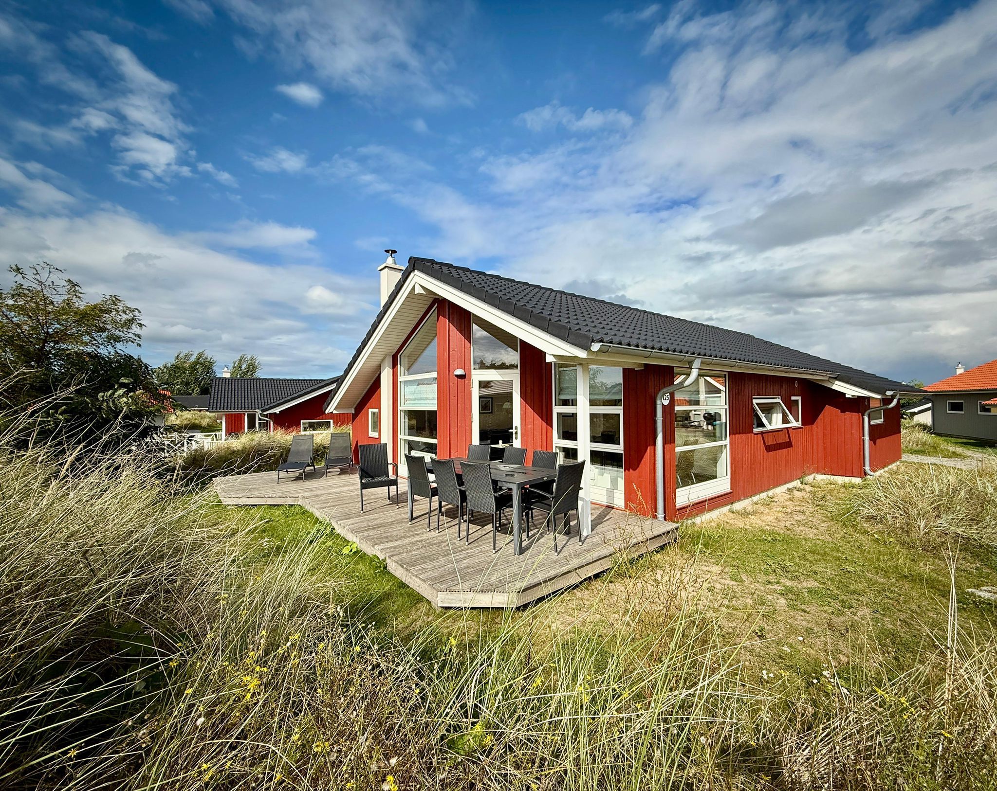 Das skandinavisch eingerichtete 79m² große Ferienhaus bietet Platz für bis zu 8 Personen und zwei Hunde. Das Ferienhaus ist geräumig, hell und geschmackvoll gestaltet, große Fenster sorgen für viel Licht und eine angenehme Wohnatmosphäre. Das Ferienhaus ist sehr geräumig, hell und freundlich gestaltet, die großen Fenster sorgen für eine angenehme Wohnatmosphäre. Mit 3 nebeneinander liegenden Schlafzimmern und dem Alkoven befinden sich Schlafplätze für max. 8 Personen im Haus. 2 Schlafzimmer verfügen über Doppelbetten, 1 Schlafzimmer über 2 Einzelbetten und der bei Kindern und Teenagern beliebte Alkoven ist mit einen weiteren Doppelbett ausgestattet. Ein Kinderbett und ein Kinderhochstuhl gehört zum Haus. Ein offener Wohn- und Küchenbereich sorgt für ein großzügiges Wohngefühl, das gemütliches Sofa lädt zum Chillen ein und am großen Esstisch genießen Sie Ihre selbstgekochten kulinarischen Highlights. Im Wohnbereich befinden sich der Kaminofen, der Flachbild Sat-TV, ein DVD-Player bzw. Blue-Ray Player, eine hochwertige Teufel Anlage (Radio mit FM, DAB/DAB+, USB Wiedergabe, Bluetooth). Vom Wohnbereich aus haben Sie Zugang zur teils überdachten, mit Gartentisch, Sonnenschirm 270cm mit Kurbelvorrichtung knickbar und Stühlen möblierten Terrasse, auf der Sie die langen Sommerabende genießen können. 2 Sonnenliegen stehen Ihnen ebenfalls zur freien Verfügung. Im Haus befinden sich 2 Badezimmer mit Fußbodenheizung. Vom größeren Bad aus haben Sie Zugang zur eigenen Sauna sorgt für das gute Wohlbefinden. Zur Ausstattung gehört eine Waschmaschine mit Trocknerfunktion. Die Küche ist vollwertig ausgestattet mit Spülmaschine, Kühlschrank mit Gefrierfach, Ceranfeld-Herd, Mikrowelle und Kaffeemaschine. Bitte beachten Sie: Manche Häuser verfügen über ein Geländer um die Terrasse herum, andere nicht. Bei den Außen- und Innenbildern handelt es sich um Modellbilder unterschiedlicher Ferienhäuser.