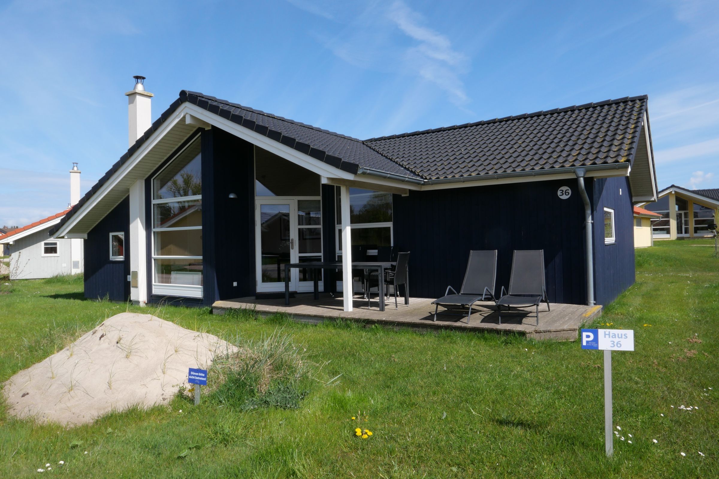 Sehr ansprechendes und großzügiges Ferienhaus 79m² groß im skandinavischen Stil und in Laufnähe zum Südstrand von Großenbrode gelegen. Durch eine gelungene Raumaufteilung ist dieses Haus gut für mehrere Generationen geeignet und ideal für 6-8 Personen. Hunde sind ebenfalls willkommen. Das Ferienhaus ist geräumig, hell und geschmackvoll gestaltet, große Fenster sorgen für viel Licht und eine angenehme Wohnatmosphäre. Die 3 Schlafzimmer liegen räumlich etwas versetzt. Ein großes Schlafzimmer mit Doppelbett liegt gleich neben dem großen Badezimmer mit Whirlpool, Sauna und Dusche. Die zwei weiteren Schlafzimmer sind mit Doppelbett bzw. zwei Einzelbetten ausgestattet und liegen auf der anderen Seite des Hauses nahe dem kleinen Bad mit Dusche. Im Alkoven befinden sich zwei zusätzliche Schlafplätze mit Doppelbett, immer sehr beliebt bei den jüngeren Familienmitgliedern. Ein Kinderbett und ein Kinderhochstuhl befinden sich im Haus. Der offene und zentrale Wohn- und Küchenbereich bildet den gemütlichen Treffpunkt für alle und sorgt für ein großzügiges Wohngefühl. Eine große und gemütliche Sofaecke lädt zum Chillen ein und am etwas separat stehenden Esstisch lassen sich die gemeinsamen Mahlzeiten und kulinarischen Highlights genießen. Im Wohnbereich befinden sich der Kaminofen, der Flachbild Sat-TV, ein DVD-Player bzw. Blue-Ray Player, eine Stereoanlage mit Radio. Vom Wohnbereich aus haben Sie Zugang zur teils überdachten, mit Gartentisch und Stühlen möblierten Terrasse, auf der Sie die langen Sommerabende genießen können. 2 Sonnenliegen stehen Ihnen ebenfalls zur freien Verfügung. Die 2 Badezimmer verfügen über eine Fußbodenheizung. Vom größeren Bad aus haben Sie Zugang zur eigenen Sauna und dem Whirlpool. Zur Ausstattung gehört eine Waschmaschine mit Trocknerfunktion. Die Küche ist vollwertig ausgestattet mit Spülmaschine, Kühlschrank mit Gefrierfach, Ceranfeld-Herd, Mikrowelle und Kaffeemaschine. Bitte beachten Sie: Manche Häuser verfügen über ein Geländer um die Terrasse herum, andere nicht. Bei den Außen- und Innenbildern handelt es sich um Modellbilder unterschiedlicher Ferienhäuser.