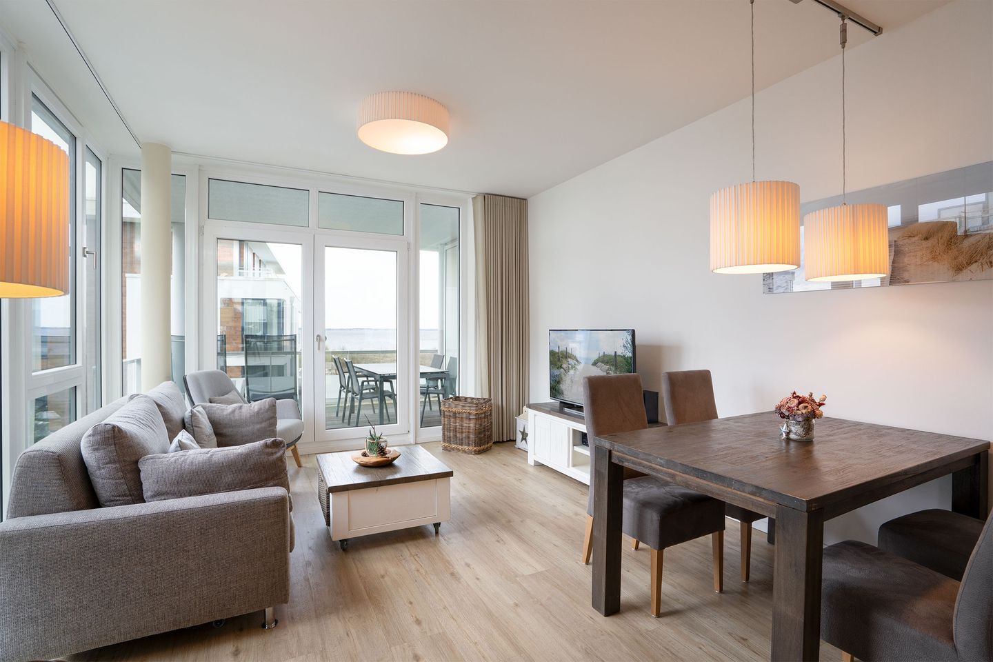 Dieses helle 77 m² große 3-Zimmer-Apartment ist für 4 Personen ausgelegt und befindet sich im 2. OG. Ihr Auto steht während des Urlaubs sicher in der Tiefgarage. Das Apartment bietet ein großes und lichtdurchflutetes Wohnzimmer mit offener Küche und moderner, maritimer Einrichtung. Die Küche ist voll ausgestattet und sogar ein Thermomix steht für Sie bereit! Durch die teilweise umlaufende Fensterfront genießen Sie einen einmaligen Ostseeblick, der lediglich durch die vordere Gebäudereihe etwas eingeschränkt ist. Vom Wohnbereich aus gelangen Sie auf den Balkon, der mit zwei Sonnenliegen, einem Sonnenschirm und einem Tisch mit vier Stühlen zum Verweilen einlädt. Des Weiteren verfügt das Apartment über zwei Schlafzimmer, jeweils mit einem komfortablen Boxspring-Doppelbett ausgestattet. Eines der Schlafzimmer bietet Zugang zum Vollbad, während ein weiteres Duschbad über den Wohnungsflur erreichbar ist. Erleben Sie das Apartment bereits jetzt durch einen virtuellen 360° Rundgang!