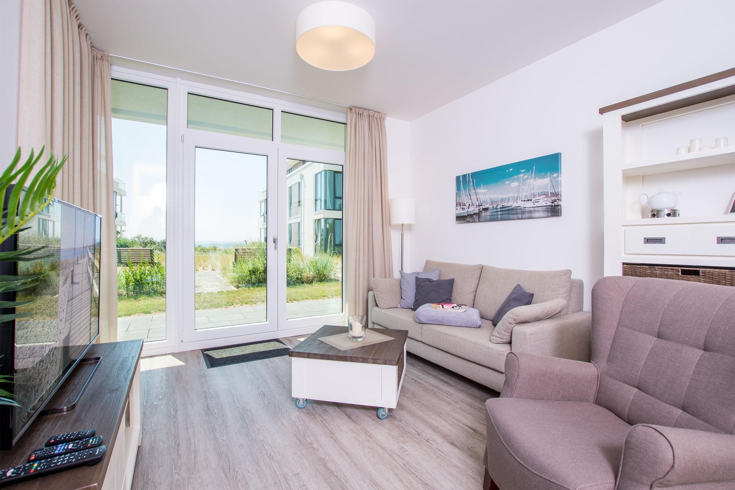 Das 60 m² große 2-Zimmer-Apartment befindet sich im 1. OG des Hauses B und ist für eine Belegung mit 2 Personen und Hund ausgelegt. Ihr Auto können Sie auf dem wohnungseigenen Tiefgaragenstellplatz parken. Mit dem Aufzug oder über die Treppe gelangen Sie zum Apartment. Der einladende Flur führt Sie ins schöne Badezimmer mit Badewanne und Dusche. Zurück auf dem Flur führt Sie ihr Weg direkt in das Herzstück des Apartments - den Wohnbereich. Hier erwarten Sie eine offene Einbauküche, ein einladender Essbereich und eine gemütliche Sofaecke, die zum Verweilen einladen. Genießen Sie den Blick aus dem Fenster, denn die Ostsee lacht Ihnen entgegen. Das Apartment verfügt außerdem über ein Schlafzimmer mit einem komfortablen Boxspring-Doppelbett. Die Terrasse ist sowohl vom Wohnzimmer als auch vom Schlafzimmer aus zugänglich und ist mit zwei Sonnenliegen sowie einem Tisch mit vier Stühlen ausgestattet. Der Strand liegt nur wenige Schritte von Ihrer Ferienunterkunft entfernt. Erleben Sie das Apartment bereits jetzt durch einen virtuellen 360° Rundgang!