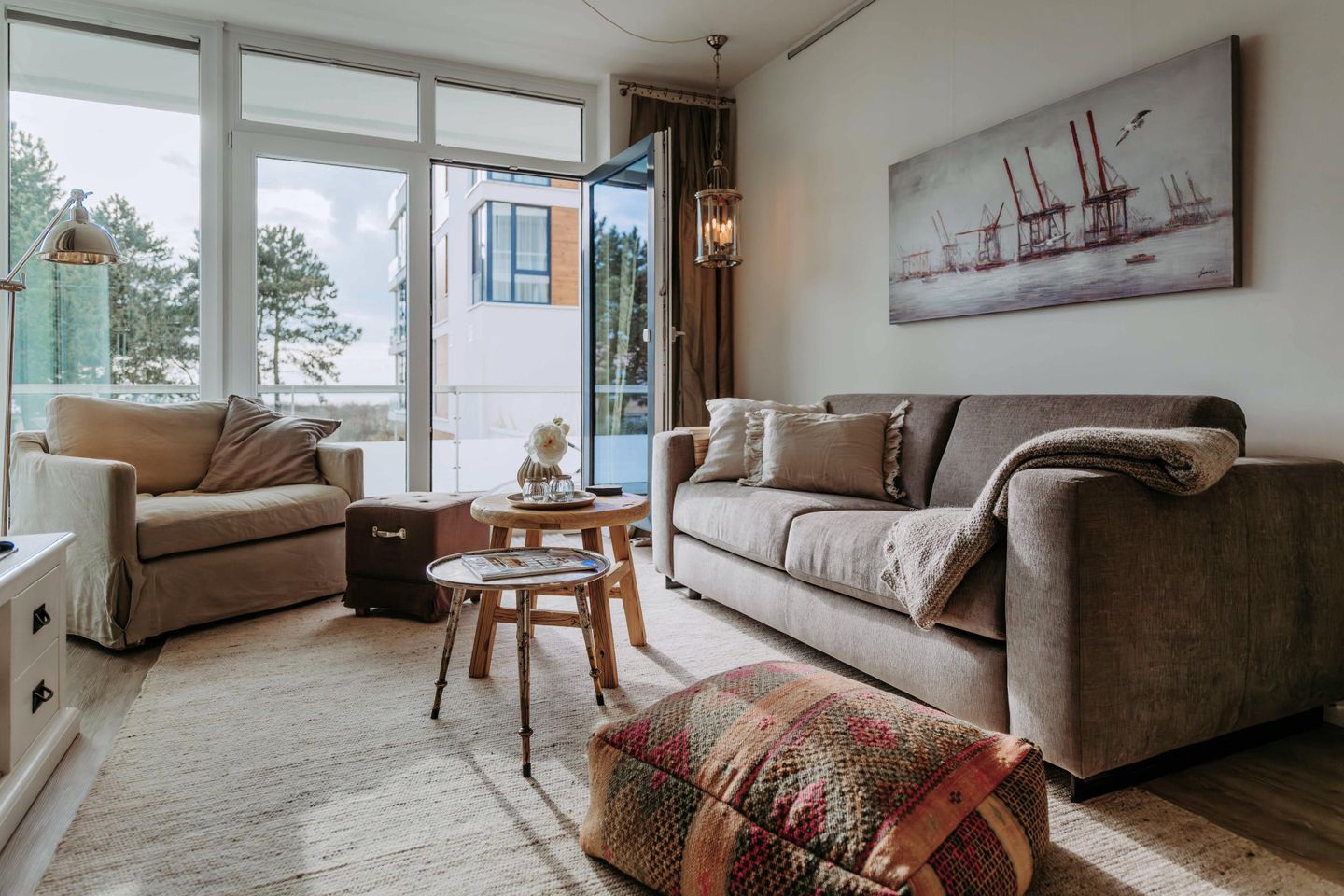 Ihr 62 m² großes Ferienapartment befindet sich im 1. OG des Hauses D. Es ist für eine Belegung mit 4 Personen ausgelegt. Parken Sie Ihr Auto auf dem zum Apartment gehörenden Außenstellplatz, der sich direkt vor dem Haus befindet. Sie gelangen mit dem Aufzug oder über die Treppe zu Ihrem Apartment. Verweilen Sie im lichtdurchfluteten Wohnzimmer auf dem Sofa oder genießen Sie den Meerblick aus der Fensterfront. Das Sofa bietet eine weitere Schlafmöglichkeiten für zwei Personen. Angrenzend an das Wohnzimmer finden Sie einen Essbereich sowie eine offene, gut ausgestattete Küchenzeile mit einer Nespresso-Maschine. Des Weiteren gibt es ein modernes Badezimmer mit Dusche und Badewanne sowie ein Schlafzimmer mit einem Boxspring-Doppelbett. Die Sonnenterrasse mit romantischem Meerblick erwartet Sie mit bequemen Balkonmöbeln, die zum gemütlichen Beisammensein einladen. Der Strand befindet sich nur wenige Schritte von Ihrer Ferienunterkunft entfernt! Auch Ihr Hund ist in dieser Unterkunft herzlich willkommen! Erkunden Sie das Apartment bei einer virtuellen 360°-Tour https://my.matterport.com/models/5KEgrtHrmgH?section=media