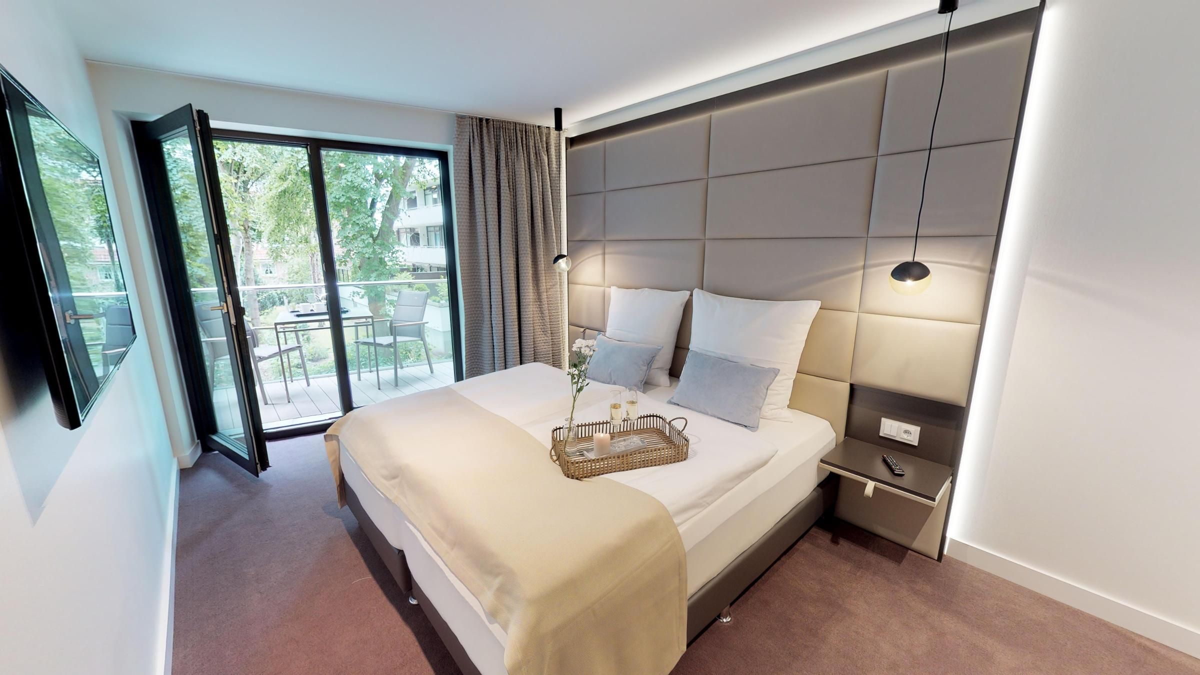 Die herrliche Luxussuite 1.06 im 1. Obergeschoss bietet mit ihren 77 m² Platz für 4 (+1) Personen. Die Suite verfügt über zwei separate Schlafzimmer sowie ein Schlafsofa im Wohnbereich für 1 Person. Sie erwartet eine gut ausgestattete Küche mit einem anschließenden Essbereich im Wohnzimmer. Der offene Wohn- und Essbereich wird durch eine gemütliche Couch abgerundet, die als Schlafplatz für eine Person dient. Beide separate Schlafzimmer verfügen über ein Boxspring-Doppelbett und haben Zugang zum Balkon. Darüber hinaus gibt es ein luxuriöses Duschbad. Ein Haltegriff in der Dusche ist vorhanden. Highlights der Suite sind die eigene kleine Sauna (1,17m x 1,17m) sowie der möblierte Balkon, der entspannte Stunden an der frischen Meeresluft ermöglicht! Zur Wohnung gehört ein Tiefgaragenstellplatz. Erleben Sie eine virtuelle Reise durch das Apartment mit dem 360°-Rundgang!